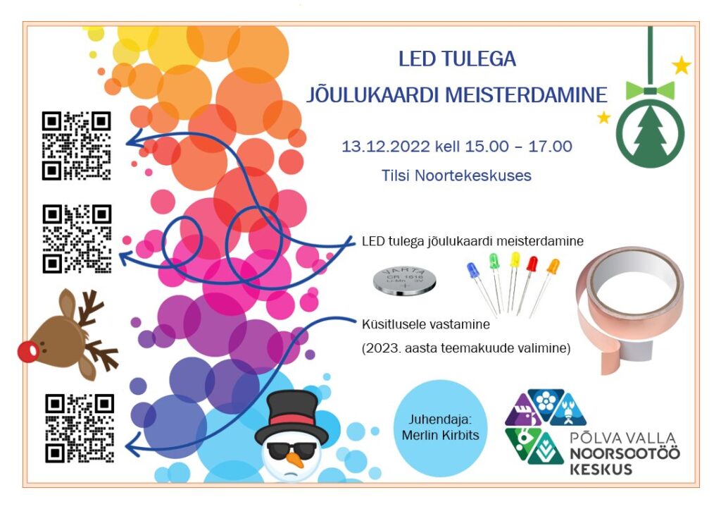 13.12.2022 toimus Tilsi Noortekeskuses selle aasta viimane LED tulega jõulukaardi meisterdamise töötuba. Kokku osales töötoas 9 noort. Juhendamisel ning pildistamisel oli abiks Mirelle ning koos noortega said meisterdamist proovida ka noorsootöötajad Tiia ja Jane.