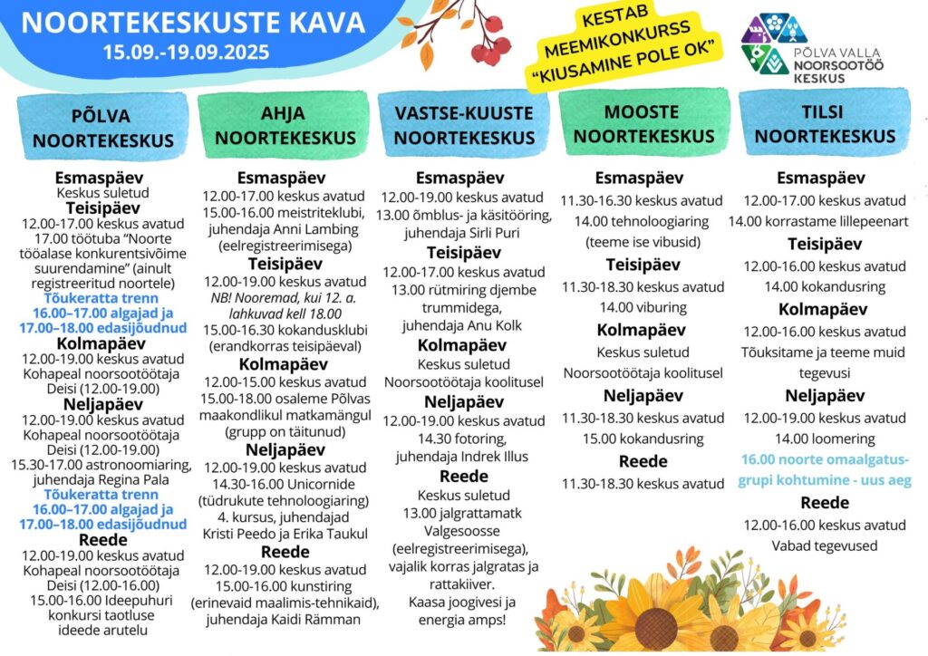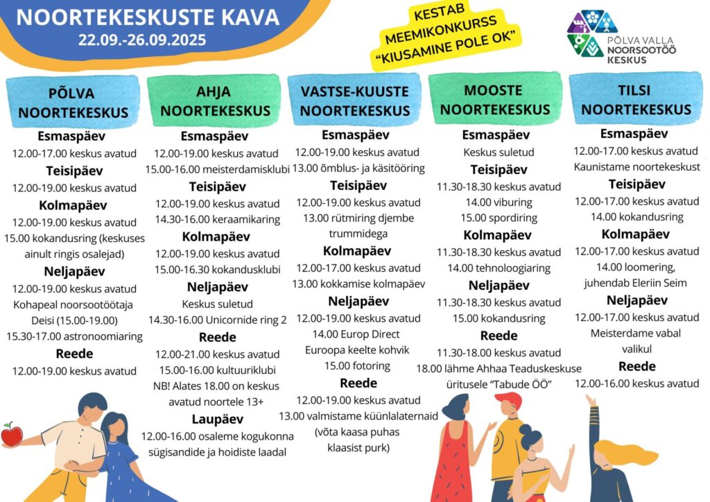 Noortekeskuste kava 15.09.2025-19.09.2025