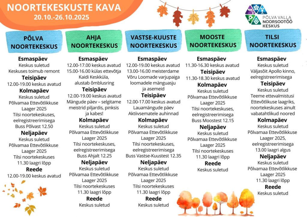 Noortekeskuste kava 20.10.2025-26.10.2025