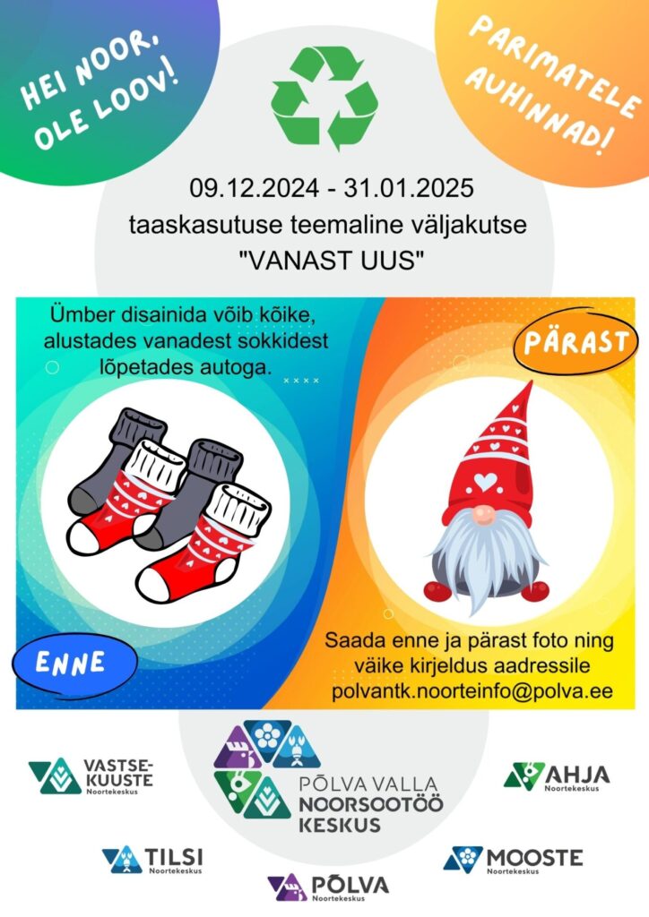 Põlva valla Noorsootöö Keskuse 2024. aasta detsembrikuu teema oli “Säästlik tarbimine ja taaskasutus” ning selle raames korraldasime 09.12.2024-31.01.2025 ühe toreda väljakutse. Väljakutse käigus said näiteks uue välimuse ja sisu nii vanad pildiraamid kui klaaspurgid. Üksikud sokid muutusid omanäolisteks mänguasjadeks, riideribad ja pärlid põimusid uhketeks kaelakeedeks, teksapükstest sai hoopis mobiilitasku ning vanast kampsunist kindad. Uue ilme said ka toidupakendid, näiteks piimapakist valmis praktiline lindude söögimaja. Suur rõõm on tõdeda, et noored olid oma tegutsemises väga loovad ja nupukad. Lisaks sai üsna ruttu selgeks, et vanu või katkisi asju tasub väärtustada ja nendele uue elu andmine aitab säästa looduskeskkonda.